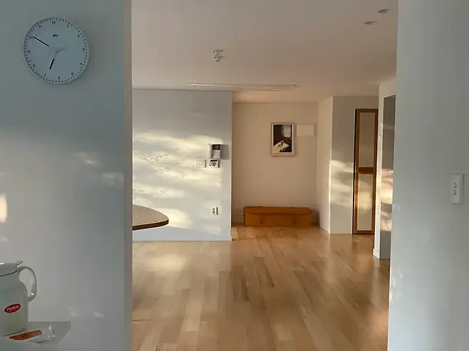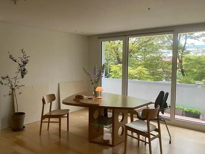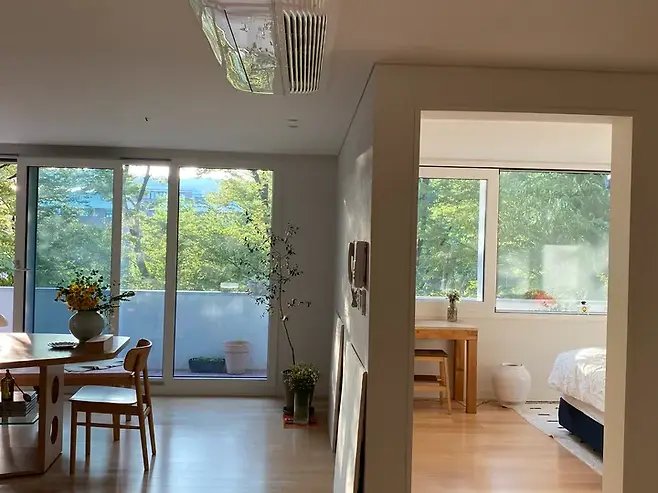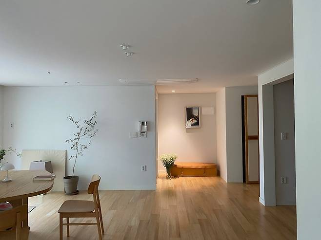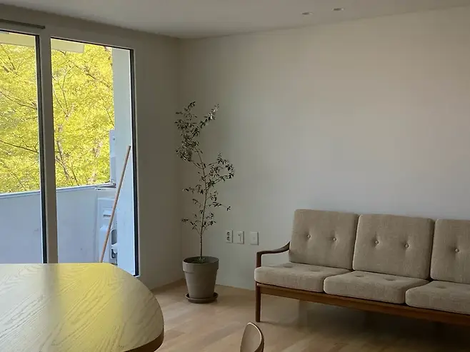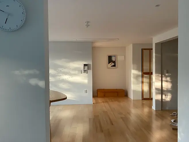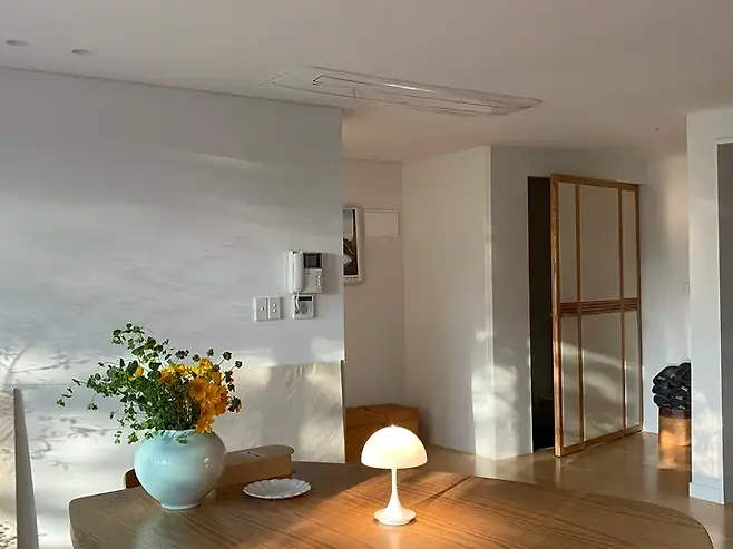 거실엔 비싼 테이블을(만) 들였습니다. 거실의 크기는 많이 큰 편이 아닙니다. 2개 이상의 가구가 들어가면 꽉 차는 구조입니다. 또한 시스템에어컨을 설치하며 천장이 10mm가 낮아진 상태였습니다.