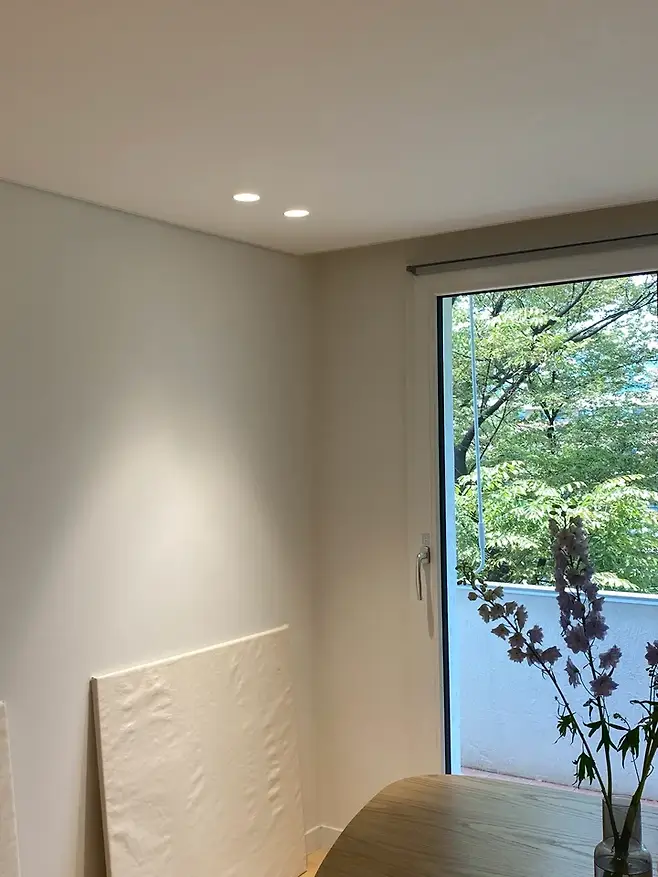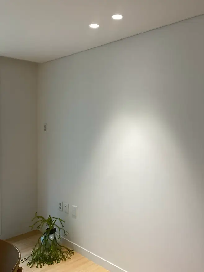 천장 매립등(다운라이트 조명)을 설치했습니다. 수량은 적지만, 전략적으로 흰 벽을 비추도록 배치했습니다. 흰 벽에 반사된 빛은 마루에 비추는 빛보다 집을 밝게 만듭니다. 거실엔 다운라이트 조명이 6개뿐이지만 생활하는데 무리가 없습니다.