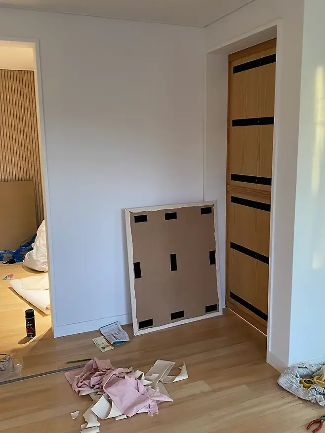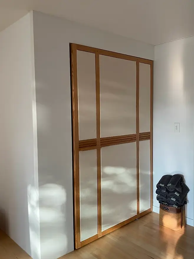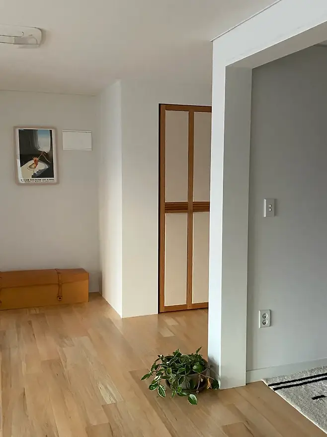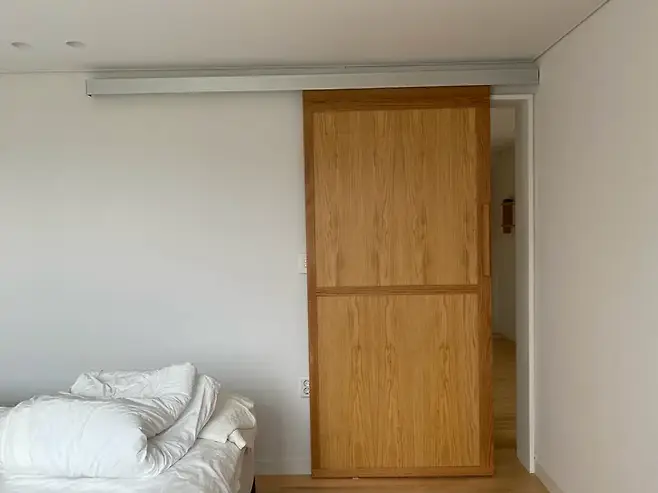 문은 주문 제작을 했습니다. 남편이 학생 때 가르침을 받았던 목공예 작가님께 저희가 디자인한 시안을 전달드렸습니다. 작가님의 두 달여 긴 작업 끝에 3개(침실, 작업실, 현관 중문)의 문을 받았습니다. 화이트 오크와 레드 오크의 조합인 원목 미닫이문입니다.