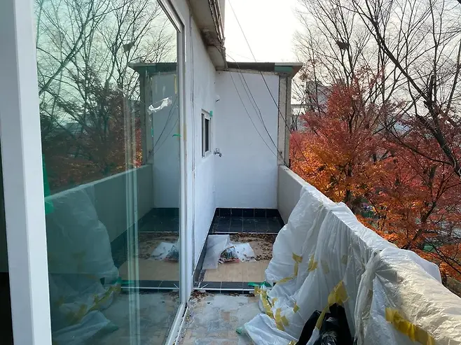 베란다는 지붕을 뜯고 야외 테라스를 만들었습니다. 불법으로 테라스를 베란다로 확장한 영역이었기에, 입주를 위해 철거를 해야만 했습니다. 지붕을 뜯은 후에는 창밖 풍경이 더 잘 보여서 집 고친 후가 더욱 기대가 되었습니다.