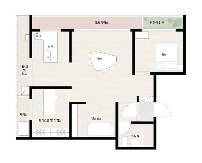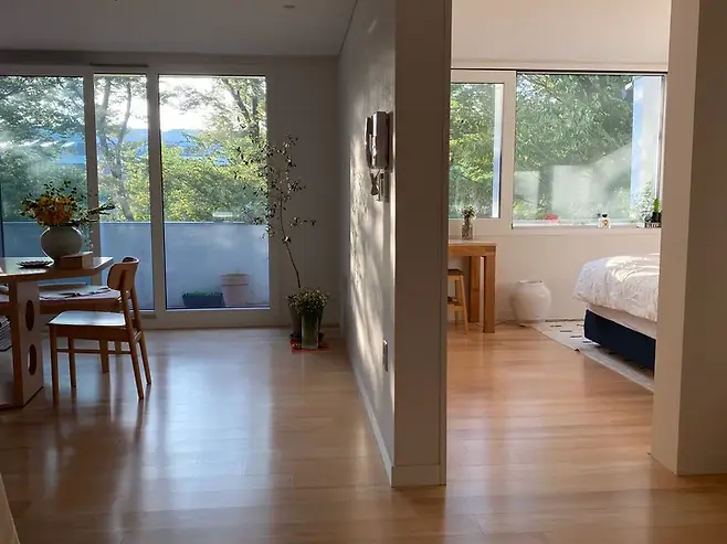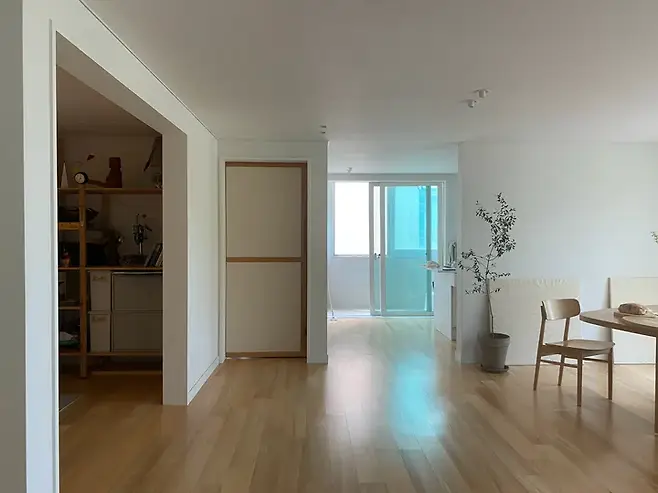 특히 주방에서 현관 쪽을 바라볼 때, 주방 끝부터 침실 입구까지 막힘없이 쭉 이어져 있어서 거실에 깊이감이 느껴집니다.