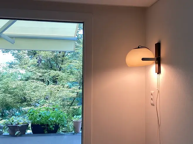 생활 가능한 정도의 조도를 확보한 다음에는, 마음에 드는 벽 램프로 분위기를 만들었습니다. 70년대 네덜란드 Dijkstra 사의 시그니처 디자인 벽 램프는 머시룸 형태의 아크릴 쉐이드가 베이지 톤으로 그라데이션 되어 있고, 재질의 특성상 램프 전체가 밝아지면서 높은 조도를 확보할 수 있는 장점이 있습니다.