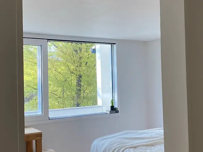 침실은 온전히 고요하게 쉬는 공간으로 만들고자 했습니다. 자연의 빛을 최대한 끌어올 수 있게 이중창을 시스템 창호로 바꿔 달았습니다. 인공조명도 자제하고, 펜던트등과 천장등도 과감히 빼버렸습니다.