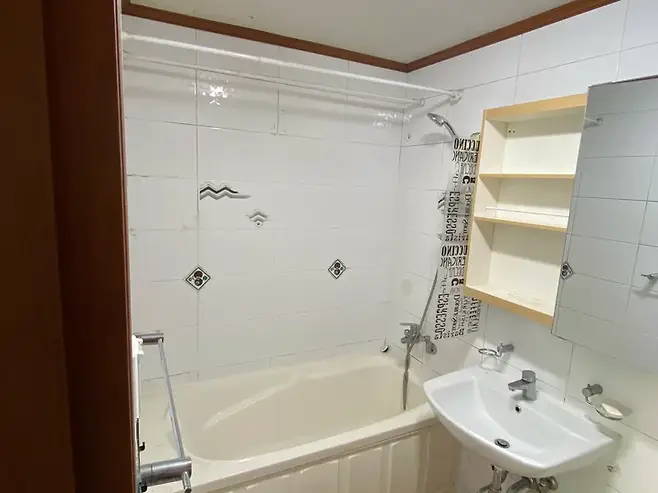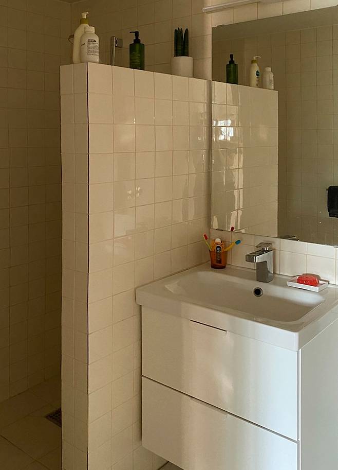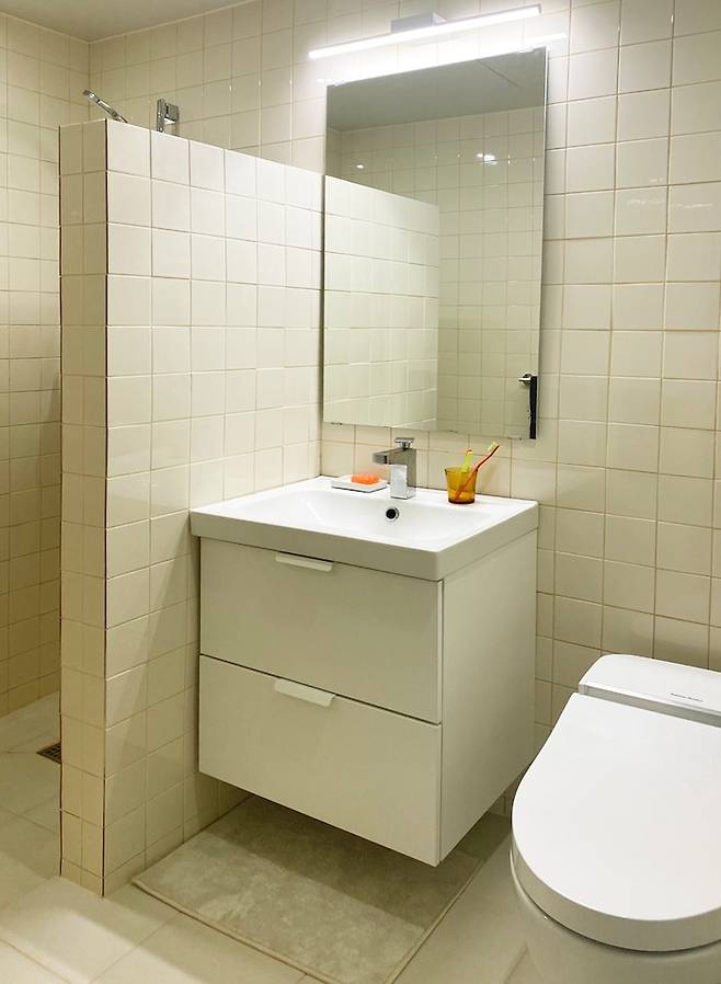 기존 화장실에는 욕조와 은경장까지 있어 좁아 보였습니다. 화장실에 '무언가 튀어나오게 하는 가구와 자재'를 줄이자는 목표로 깔끔하게 구조를 만들었습니다.
