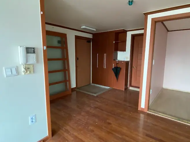 거실에서 현관으로 이어지는 경로에도 체리 몰딩과 체리색 신발장이 보였는데, 이 몰딩도 모두 제거하고 신발장 위치를 반대편으로 옮긴 후 중문을 달아, 바깥으로 나가는 시선을 차단했습니다.