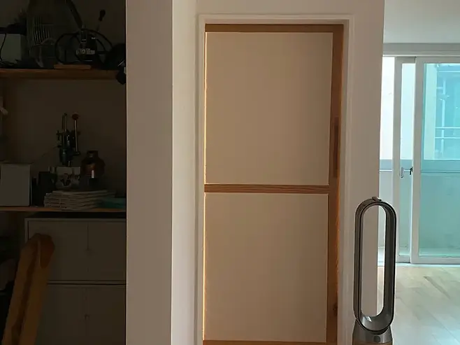 동대문 원단시장에서 사 온 흰색 광목을 직접 붙였습니다. 문에 패브릭이 붙어 있어, 흡음 효과도 얻을 수 있었습니다. 또한 문이라는 기능적인 도구 이상으로, 저희 집만의 오브제로서 심미적인 역할을 담당하고 있습니다.