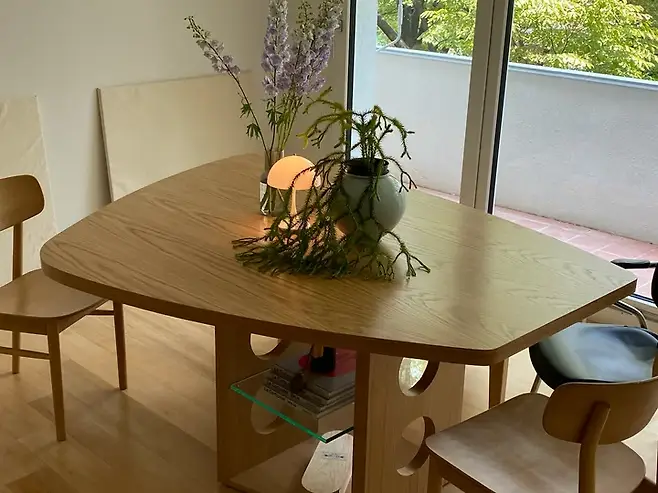 식탁으로도 쓸 수 있고, 책을 읽거나 노트북을 할 수 있도록 테이블을 놓기로 하였고 tecta에서 나온 m21 테이블을 보는 순간 그 외 다른 테이블은 눈에 들어오지 않았습니다. (주문 후 배송하기까지 무려 5개월이나 걸렸는데, 그동안은 좌식생활을 하였습니다.)