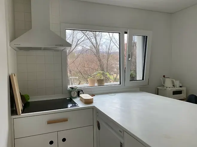기존에 있었던 창문을 철거하고, 새 창호를 달아 화이트 주방에 최대한 자연 빛을 끌어오고자 했습니다.