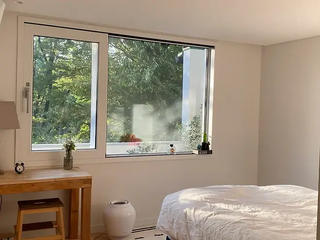 우리 침실이 조금 더 특별한 이유는 침대에서 사계절과 날씨를 느낄 수 있다는 것입니다. 자연과 시간의 변화를 뚜렷하게 아침마다 느낄 수 있습니다.