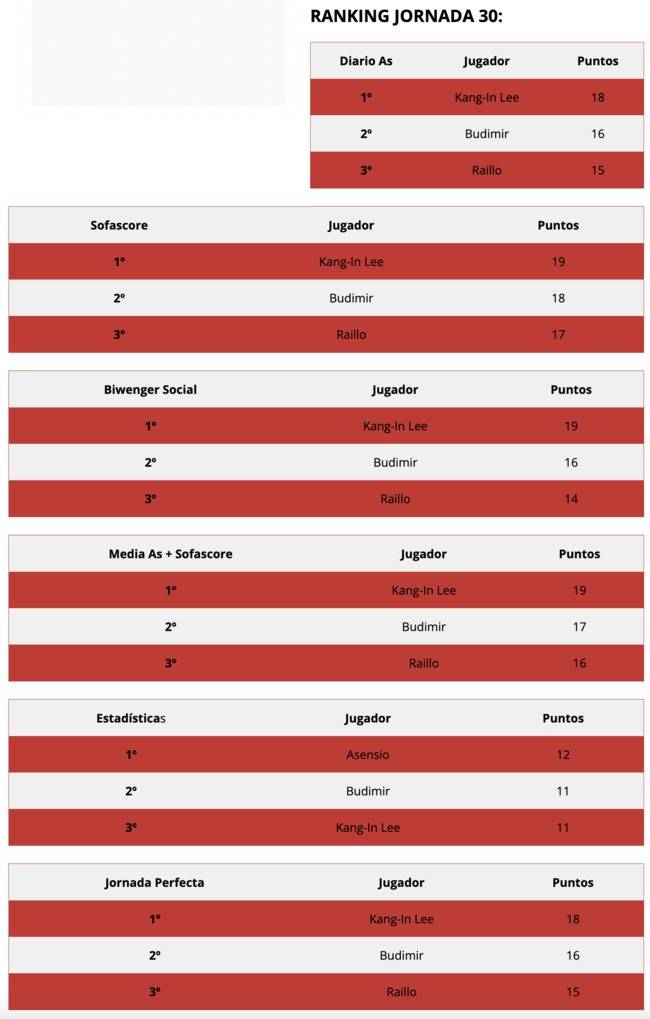 이강인은 각종 매체에서 1위를 석권했다. 스페인 매체 '디아리오 아스', 축구 통계 매체 '소파 스코어', 스페인 축구 통계 매체 '조르나다 페르펙타' 등은 이강인에게 최고점을 부여하며 30라운드 최고의 선수로 꼽았다.