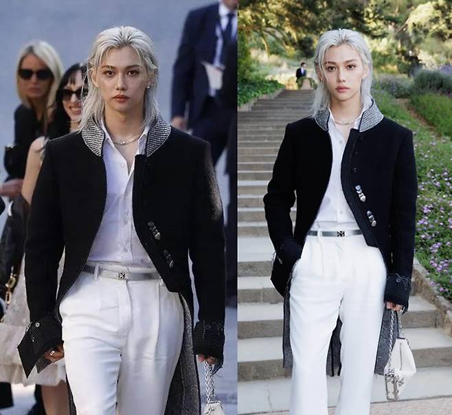 이날 펠릭스는 화이트 팬츠와 화이트 셔츠, 여기에 블랙 턱시도 재킷을 매치한 스타일리시한 블랙앤화이트룩으로 도착하자마자 뜨거운 화제를 모았다.
