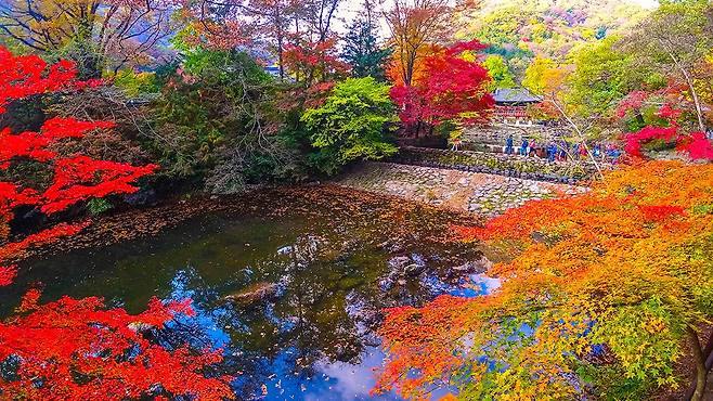 여기에 연못 위로 쏟아지는 애기단풍의 붉은 터널이 더해지면, 자연이 만든 가장 극적인 가을 풍경이 펼쳐진다.