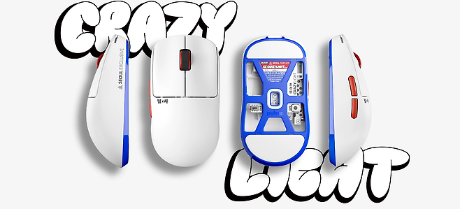 앞선 두 제품 다 현재 판매하지 않는 제품이라 아쉽다고? 그렇다면 Pulsar X2 CrazyLight 무선 서울 에디션(실시간 146,000원)에 주목! 35g의 초경량 무선 고스펙 게이밍 마우스. 한강의 딥블루, 서울의 화이트, 열정의 레드까지 세 가지 색상을 조합했다. 실물을 보면 태극기가 떠오를 정도로 조화감이 좋다.