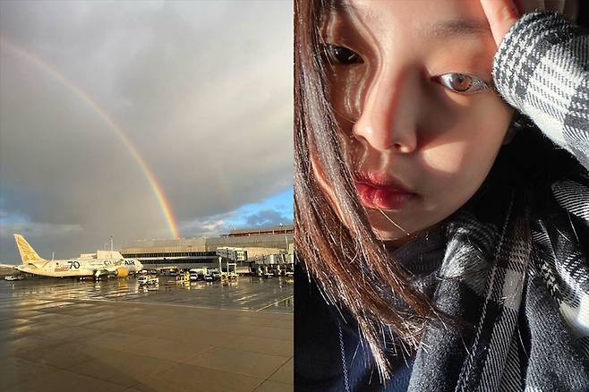 런던에 도착한 제니는 가장 먼저 런던 히드로 공항에 뜬 무지개 사진과 함께 자신의 셀카를 올렸는데요.
