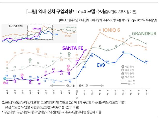 산타페는 출시 후 첫주(W+1)인 8월 4주차(8월 21일 주) 조사에서 구입의향 31%를 기록했다[그림]. 아이오닉6와 그랜저의 동일 시점 최고기록((W+1 기준 각각 27%)보다 4%포인트(p) 높은 역대 1위다. 출시 직전 주(W-1)까지도 구입의향 22%로 아이오닉6(28%)와 그랜저(27%)에 뒤졌으나 출시주에 그랜저를 따라잡고 다시 한 주 만에 아이오닉6까지 추월했다.