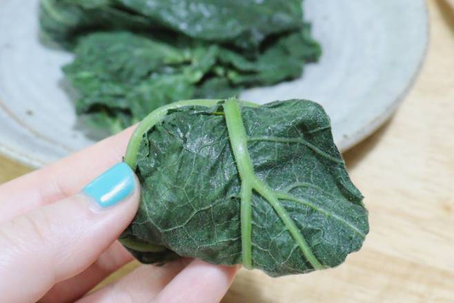 호박잎은 줄기끝을 살짝 꺽어 껍질을 벗겨서 준비해요. 껍질에는 잔털이 있어 손질을 하고 먹어야 식감이 부드러워요.
