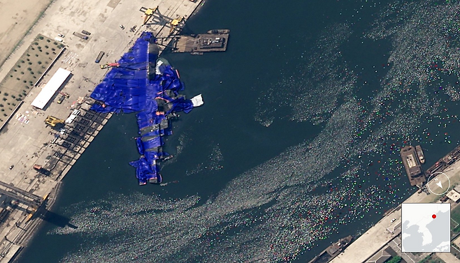 이 모습은 전복된 북한의 최현급 구축함을 보이지 않게 가리려 파란 천으로 덮어놓은 모습입니다.