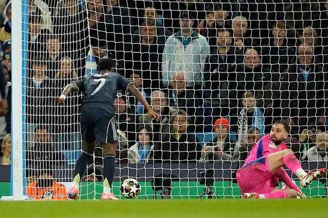 레알 마드리드(스페인)의 비니시우스 주니오르(왼쪽)가 17일(현지 시간) 영국 맨체스터 에티하드 스타디움에서 열린 2025-26 유럽축구연맹(UEFA) 챔피언스리그(UCL) 16강 2차전 맨체스터 시티와 경기 후반 추가시간 쐐기 골을 넣고 있다.