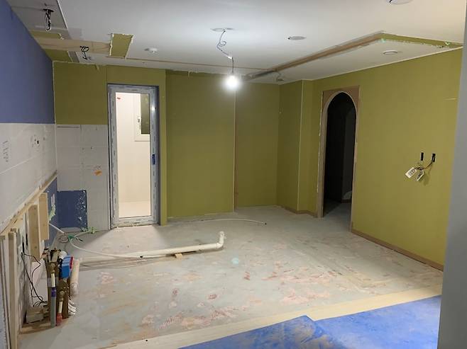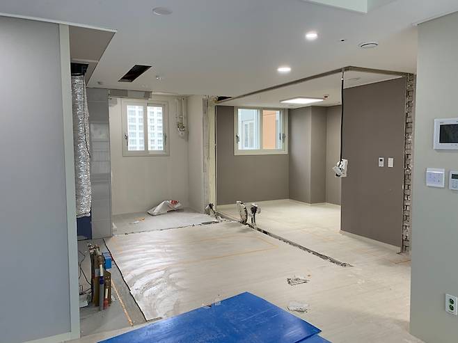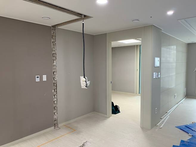 구조변경 계획에 따라 주방과 방을 나누던 벽을 완전히 철거하였고, 발코니 벽면 일부도 철거하였습니다. 철거 범위에 따라 확장과 마감의 성패가 결정되기에 현장에서 철거 범위를 세세하게 조율하였고, 가장 심혈을 기울였던 공정이기도 했습니다.
