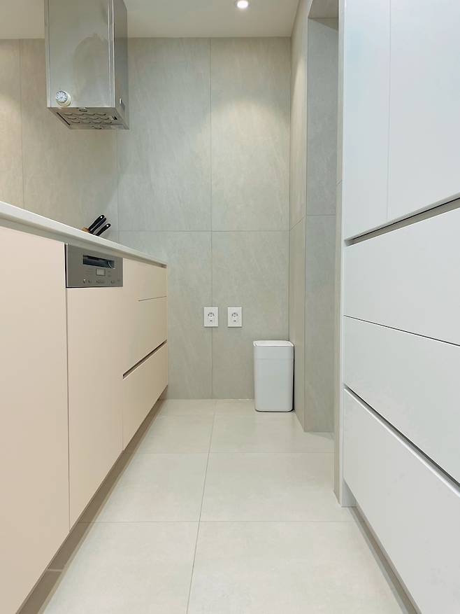 기존에 있던 벽을 허물고 주방 베란다를 확장해서 만든 키큰장입니다. 키큰장이 들어갈 깊이만큼만 확장을 했기 때문에 주방 베란다는 인지하기 어려울 정도로 아주 약간만 좁아졌어요. 완전 확장에 비해서 공사비도 많이 절감했고 이 키큰장 하나로 수납이 거의 모두 해결되었습니다.