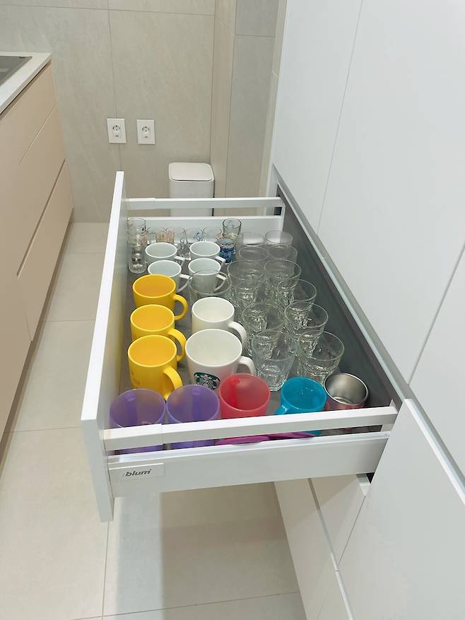 키큰장은 하단은 모두 서랍, 선 채로 손이 닿는 부분부터는 선반으로 나눠서 제작했습니다. 사진으로 보니 컵이 정말 많네요. ㅎㅎㅎ