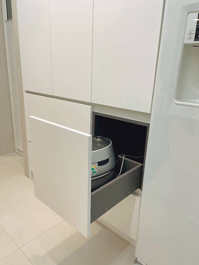 밥솥도 키큰장 안에 매립시켰고, 선반 한쪽은 조리도구와 큰 접시들, 그리고 한쪽은 상온 식재료를 보관하고 있습니다.