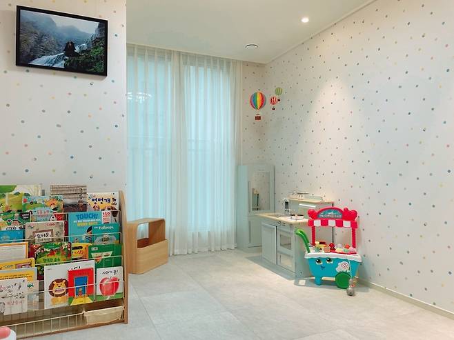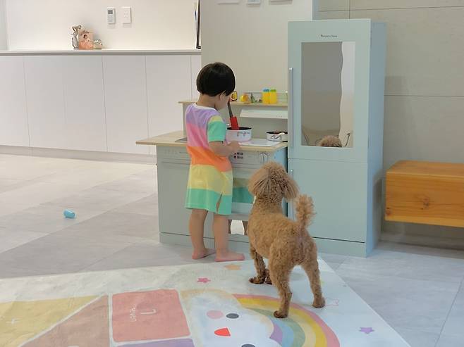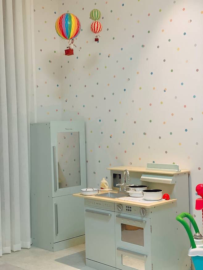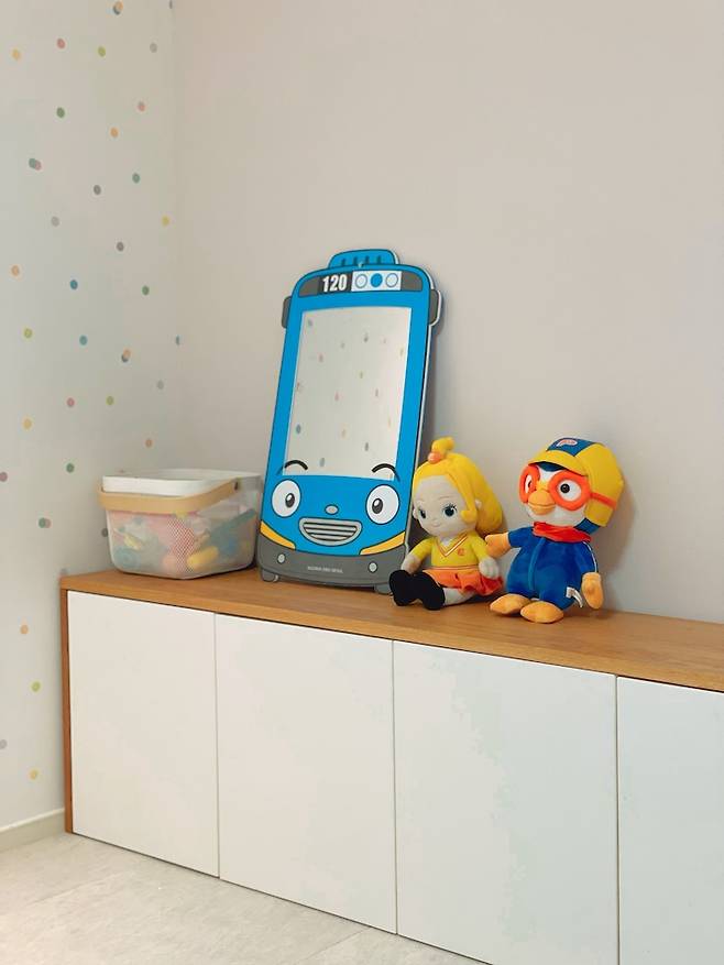 아이 방은 최대한 간결하게 사용하고 있습니다. 아이가 조금 더 크기 전까지는 아이의 시선보다 높은 가구는 배치하지 않을 예정입니다. 스스로 올라가 앉을 수 있는 낮은 교구장과 낮은 전면 책장, 그리고 주방놀이만 배치해두었습니다.