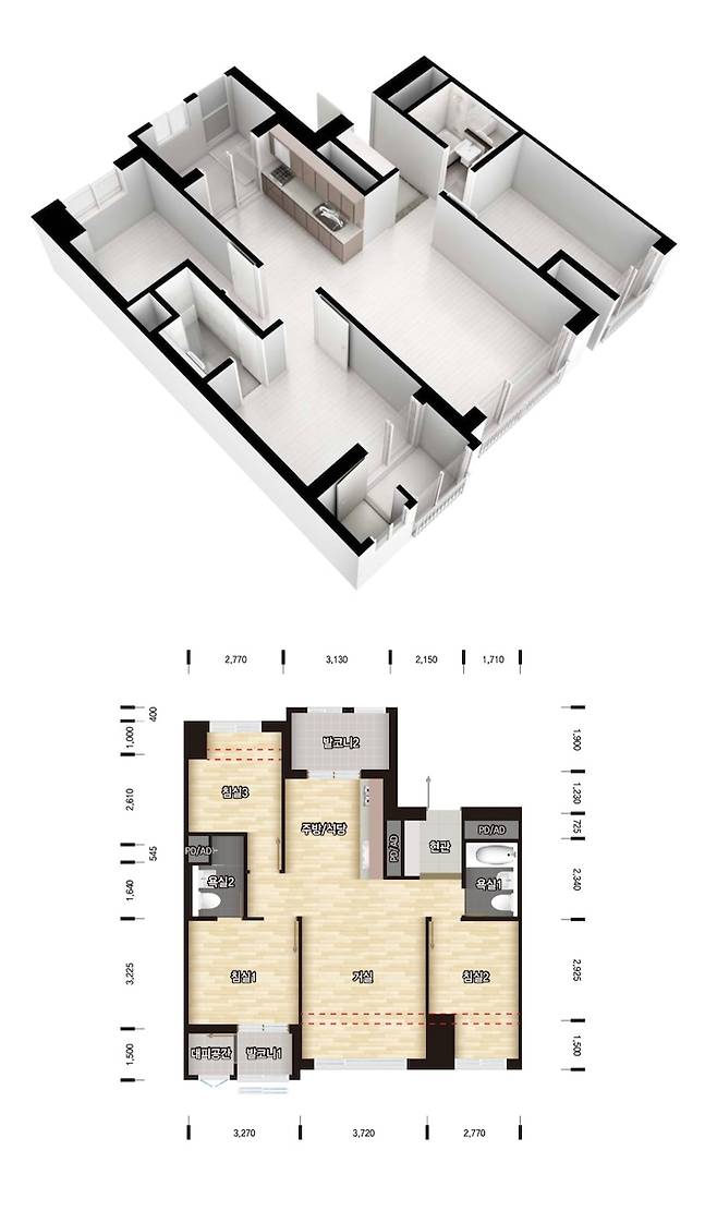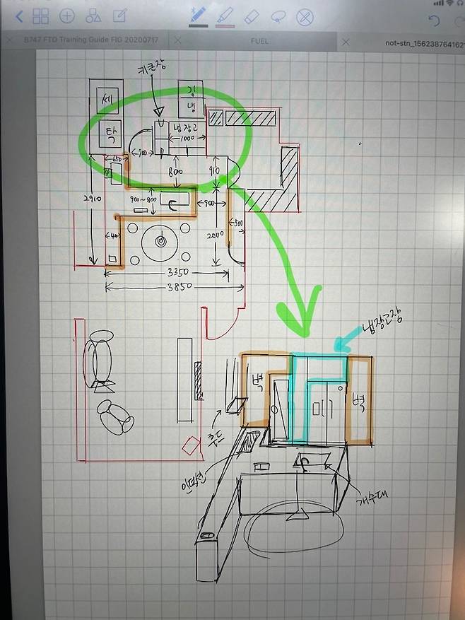 가장 시급한 것은 구조를 결정하는 것이었습니다. 한 달 동안 남편과 둘이 수십 장의 도면을 그리고 시뮬레이션을 돌리며 아이디어를 낸 끝에 주방 발코니를 일부 확장하여 수납공간과 냉장고장을 만들고, 주방 우측 방(침실 3)을 드레스룸으로서의 최소한의 공간만 남기고 확장하기로 결정했습니다.