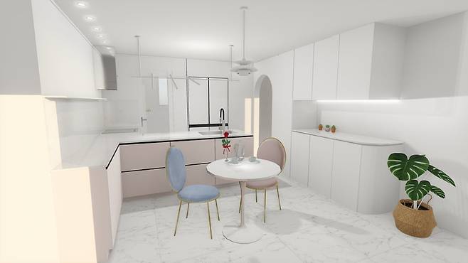 구조는 초반에 결정하였고, 이후로는 아일랜드 싱크대 색상 결정에 꽤 많은 시간을 투자했습니다. 단순히 딸아이니까 좋아하지 않을까 하는 생각에서 핑크도 후보군에 올렸는데, 핑크색 싱크대는 흔하지 않아서 참고할만한 실제 사례가 없었어요. 주방 가구업체 사장님도 핑크주방은 처음이시라 조언을 얻을 수 없었지만 밋밋한 컬러도, 어두운 컬러도 싫었던지라 하나하나 후보군을 제외해 나갔더니 결국 남는 건 핑크색이었습니다. ㅎㅎ