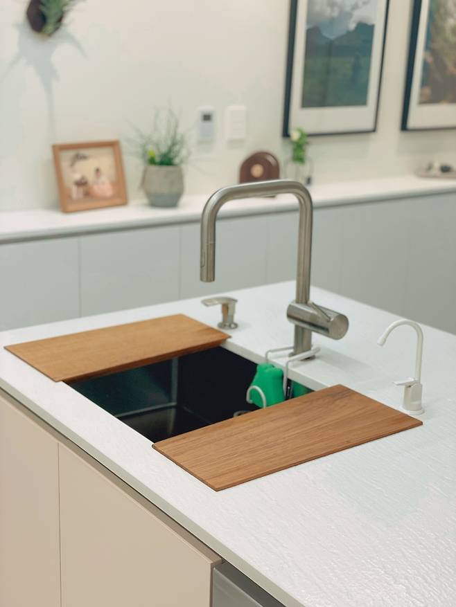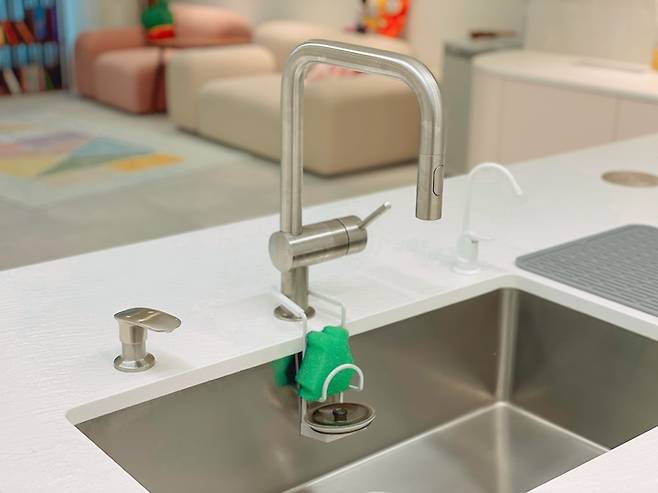 수전은 모두 직구로 구입했고 싱크 업체에서 시공을 해주셨습니다. 수전 양쪽은 세제 펌프와 언더싱크 정수기 수전입니다.