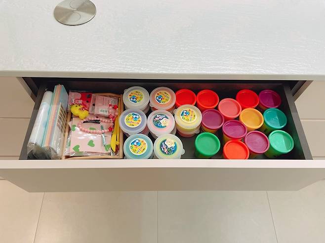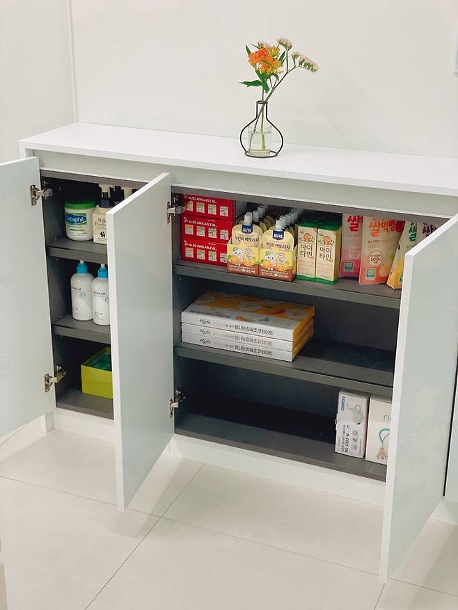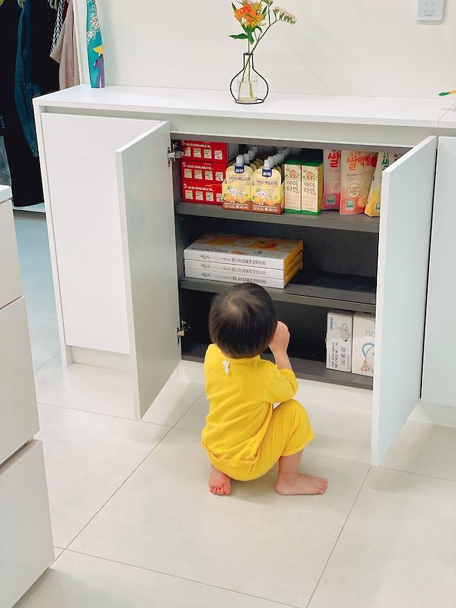 한쪽 선반에는 아이가 스스로 꺼내 먹어도 괜찮은 쌀 과자랑 음료를 넣어놓았는데, 스스로 골라 먹는게 꽤나 재미있는지 장을 열고 한참 서서 고르고 있는 모습이 너무 귀엽습니다. ㅎㅎ