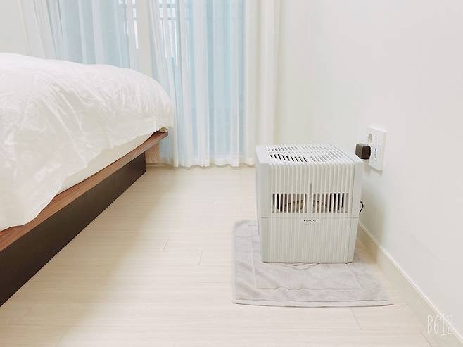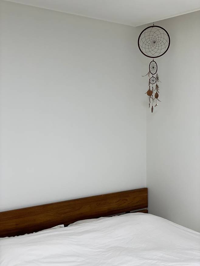 자질구레한 것을 수납할 수 있는 스툴을 들여서, 아이가 끌어안고 자는 애착 인형이나 담요 등을 넣어두고 있어요. 이외에 천장에 달린 드림캐처와, 이젠 필수품이 되어버린 벤타가 침실의 전부입니다.