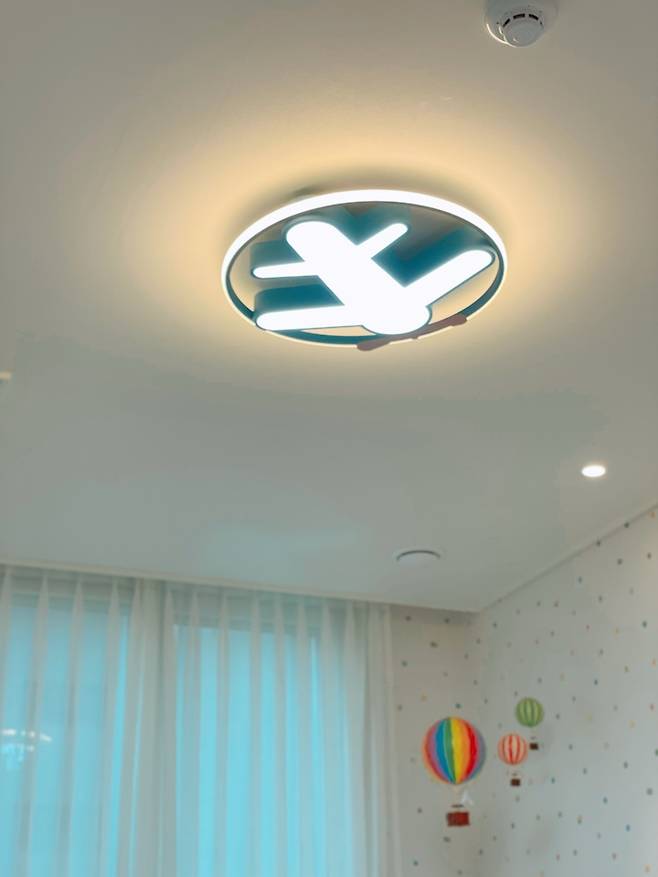 다만 너무 밋밋하지 않도록 비행기 모양의 조명과 모빌을 달아두었습니다. 애드벌룬 모양의 모빌에 아이 사진을 오려서 태워줬는데, 볼 때마다 너무 귀엽고 웃겨서 조만간 풀잎이 사진도 인화해서 옆에 탑승 시킬 예정입니다. ㅎㅎ