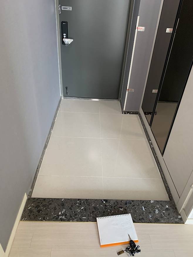 거실과 방 쪽 마루는 그대로 살리기로 결정하고 주방측 마루만 철거하고 포셀린 타일을 시공하였습니다. 주방 벽면에는 1200*600사이즈의 대형 포셀린타일을 시공했고, 재료의 통일감을 위해 터닝 도어 주변까지 타일을 접어 넣었는데 실력파 타일러분 덕분에 칼각으로 완벽하게 마감되어 정말 만족스럽습니다.