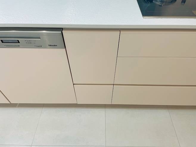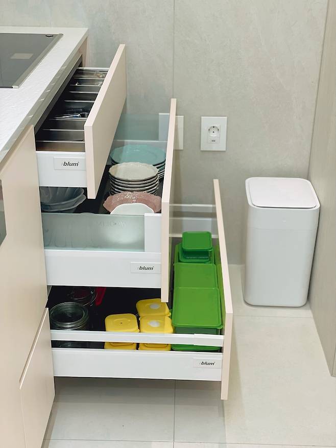 싱크대 아일랜드 앞쪽은 모두 서랍으로 수납을 할 수 있게 되어있는데, 내경이 250 정도로 깊지 않아서 크게 기대하지 않았지만, 막상 사용해보니 이 서랍이 없었으면 너무 불편했겠다 싶을 정도로 유용합니다.