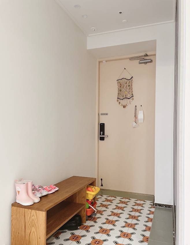현관에는 아이가 앉아서 신발을 신을 수 있는 원목 벤치를 제작해서 배치했습니다.