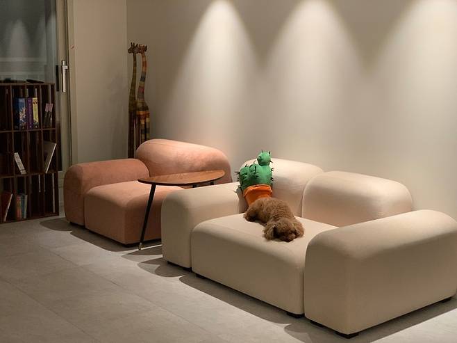 공간의 이점을 살리기 위해서 크지 않은 사이즈의 소파를 컬러를 달리해서 배치했습니다. 작은 티 테이블을 사이에 두고 1인용+2인용 소파를 나란히 배치하였더니 사용하기도 훨씬 편안합니다. 소파에 누워있지 못하는 게 장점이자 단점입니다. ㅎㅎ