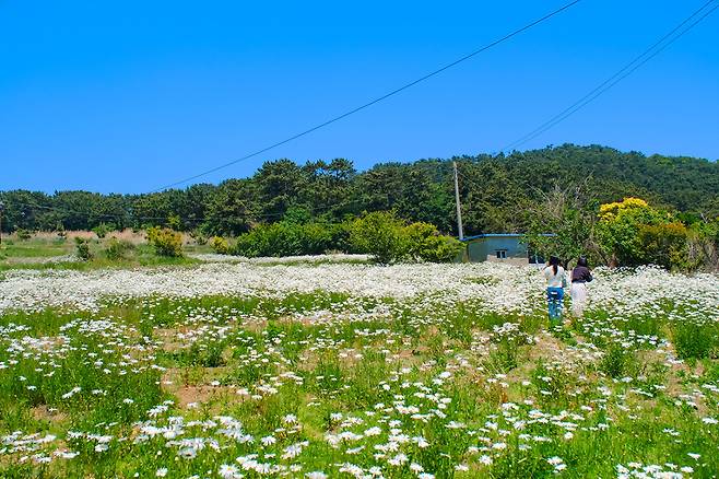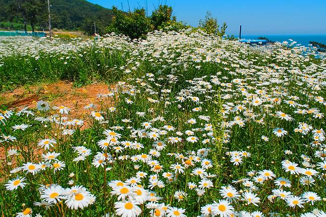 언덕 위에서 내려다보면 새하얀 데이지 꽃이 바람에 일렁이고 그 너머로 끝없이 펼쳐진 에메랄드빛 바다가 시선을 사로잡습니다. 이 조화는 마치 그림처럼 완벽하게 어우러져 사진을 찍는 모든 순간이 작품이 됩니다.