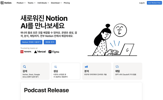 노션의 생산성 도구에 AI 기능이 추가된 버전으로, 문서 작성, 회의록 요약, 아이디어 브레인스토밍, 정리 및 요약 기능을 지원한다.