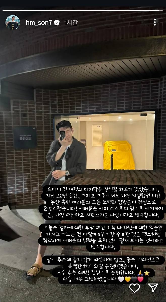 손흥민은 2026학년도 대학수학능력시험이 진행되는 당일인 13일 자신의 사회관계망서비스(SNS) 인스타그램 스토리 기능을 통해 수험생들을 응원하는 글을 적었다.