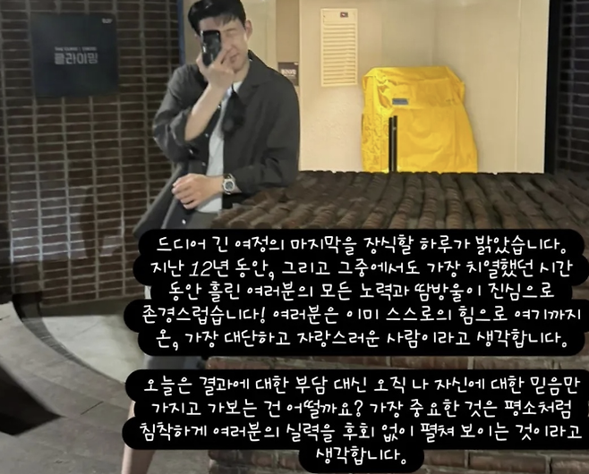 손흥민은 "드디어 긴 여정의 마지막을 장식할 하루가 밝았습니다"라며 "지난 12년 동안, 그리고 그중에서도 가장 치열했던 시간 동안 흘린 여러분의 모든 노력과 땀방울이 진심으로 존경스럽습니다! 여러분은 이미 스스로의 힘으로 여기까지 온, 가장 대단하고 자랑스러운 사람이라고 생각합니다"라고 썼다.