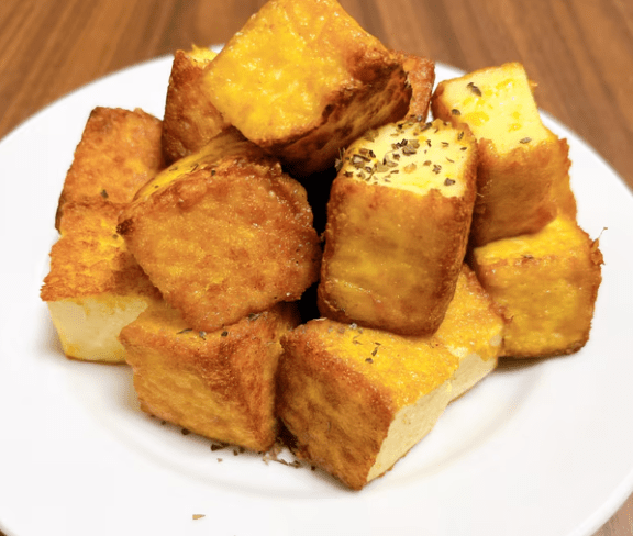두부는 도톰하게 썰어 물기를 뺀 뒤, 부침가루와 카레가루를 1:1 비율로 섞은 가루에 앞뒤로 골고루 묻혀주는 방식이 이상적이다. 중불에서 식용유를 살짝 두르고 앞뒤로 노릇하게 구우면, 튀기지 않아도 튀긴 듯한 맛과 식감을 낼 수 있다. 취향에 따라 파슬리 가루나 레몬즙을 곁들이면 풍미가 더욱 살아난다.