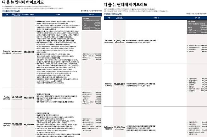 반면, 사륜구동(AWD) 모델은 복합 연비가 친환경차 인증 기준에 미달해 세제 혜택 대상에서 제외됐다. 신형 싼타페 하이브리드 AWD는 익스클루시브 4,254만원, 프레스티지 4,502만원, 캘리그래피 5,036만원이다.