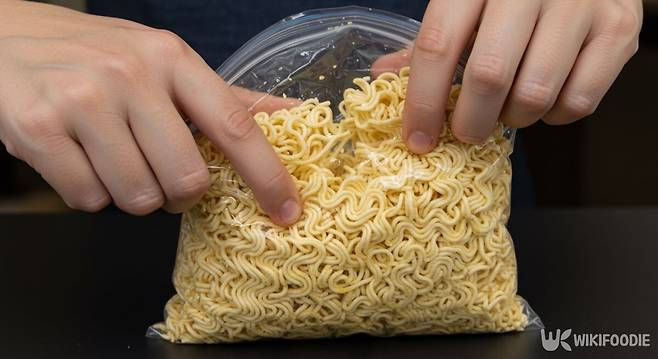 먼저 컵라면의 면, 스프, 건더기를 분리한 뒤 면을 지퍼백에 넣고 손으로 적당히 부순다. 너무 곱게 부수지 않아야 식감이 산다. 부순 라면은 다시 컵 용기에 담고, 스프와 건더기 양념도 함께 넣는다.