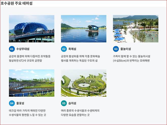 호수 위에는 다섯 개의 테마섬이 자리하고 있습니다.