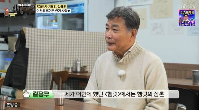 길용우는 데뷔 51년차 중견 배우로 1980년대 전성기를 보내며 총 100편의 드라마와 20편의 영화에 출연한 바. 연극 무대에 대한 애정이 남다르다는 그는 "최근에도 '햄릿'에서 햄릿의 삼촌 클로디어스 역을 맡았다"고 소개했다. 이에 허영만은 "미스캐스팅 같다. 이렇게 인자한 얼굴로 어떻게 악역을 하나"라는 말로 길용우를 웃게 했다.