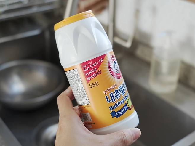 베이킹소다는 알칼리성이라 단백질과 기름때를 분리할 수 있어 기름때 제거에 효과적이라서 주방 청소 시 사용에 도움이 되는데요, 주방 세제와 섞어 싱크볼 청소나 배수구를 닦아주면 좋아요.