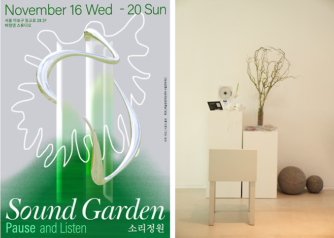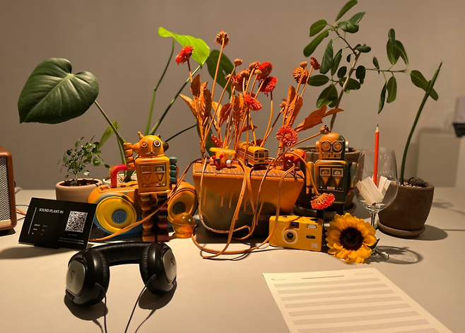 지난해 <소리 정원>(Sound Garden) 사운드마크 전시를 진행했는데요. ‘만약 이 공간에 소리를 먹고 자라는 식물이 있다면 어떨까?’라는 질문으로부터 개발을 시작했죠. 일곱 가지 공간의 고유한 소리 환경과 해당 공간에 걸맞은 식물을 주요 콘셉트로 잡았어요. 식물을 스피커와 결합해서 소리를 심을 수 있는 방식을 개발했죠. 단순히 스피커를 소리가 나오는 재생장치로만 생각하는데, 그 자체로 설치 작품이 될 수 있는 방식을 구현해 본 거예요. 그리고 각각 설치물을 헤드폰과 연결하여, 잠시 멈춰서 들을 수 있는 ‘소리 공간’을 구성했어요.
