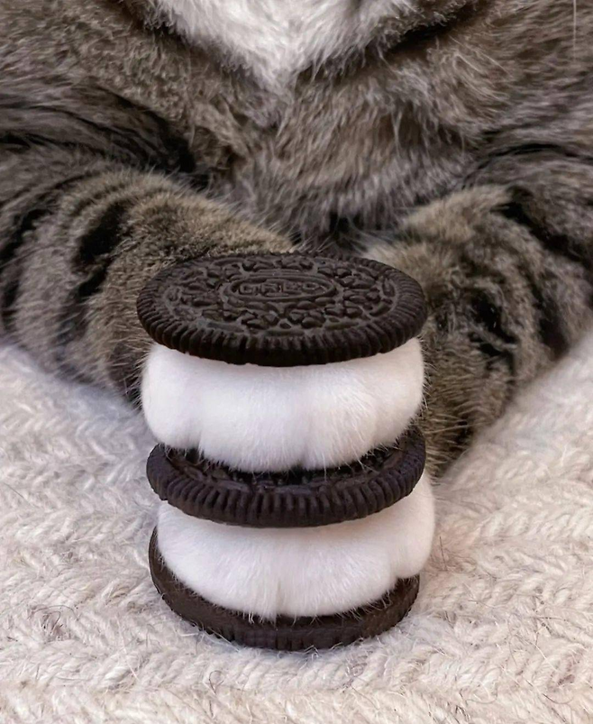 앞발을 모아 그 사이에 초코 쿠기를 끼워 넣으면 그 자체로 하얀 크림이 가득한 초콜릿과자처럼 보이기도 합니다.