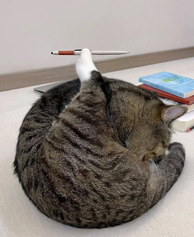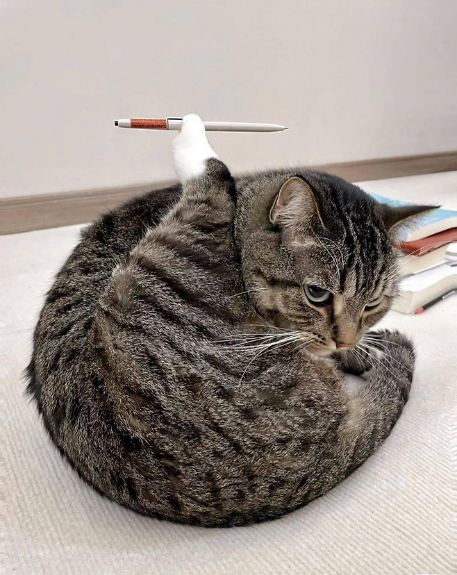 웅크려 몸을 핥고 있을 때 드러난 발가락 사이에 펜을 끼웠더니 새까맣게 탄 닭다리처럼 보이기도 하고, 고뇌하는 작가의 펜을 든 손처럼 보이기도 했습니다.